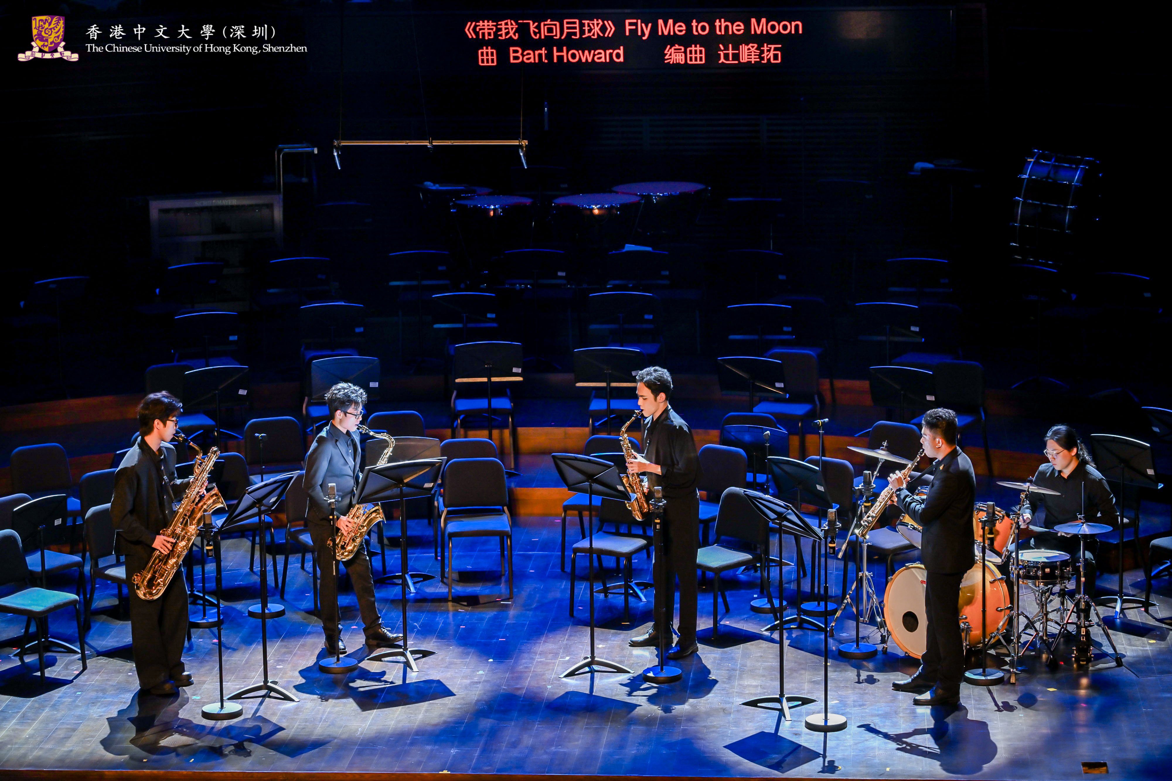 In this concert, not only the Chinese Orchestra of CUHK-Shenzhen presented a wonderful performance of Trying the Horse in Spring Countryside and New Scenes in Dunhuang, but also the A Cappella Group of CUHK-Shenzhen sang Hey Momma / Hit the Road, Jack and Waving Through a Window. Young Dance of Ling College, Martial Arts Club and choreographer Li Ziyi presented an original martial arts dance production, Nan Cheng, which gave the audience a taste of the charm of traditional martial arts and modern dance. The Chorus of CUHK-Shenzhen presented three songs, Ocean of Stars, The Letter under the Moonlight and Boundless Oceans Vast Skies, which conveyed the power and emotion of their songs and showed the personality of youth. The Chamber Group of CUHK-Shenzhen presented a saxophone quartet, Fly Me to the Moon, with a melodious sound.