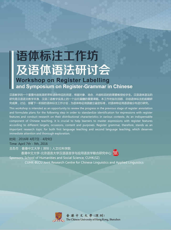 The Workshop on Register Labelling and Symposium on Register-Grammar in Chinese is to be held from April 7th?to April 9th, 2016, with the sponsorship from the School of Humanities and Social Science, CUHK(SZ) and CUHK-BLCU Joint Research Centre for Chinese Linguistics and Applied Linguistics.