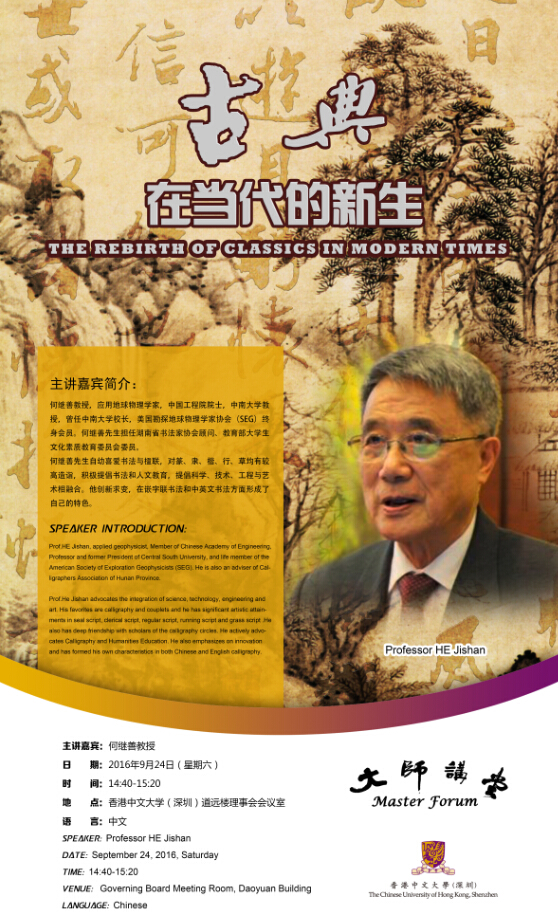 Prof.He?Jishan?advocates?the?integration?of?science,?technology,?engineering?and?art.?His?favorites?are?calligraphy?and?couplets?and?he?has?significant?artistic?attainments?in?seal?script,?clerical?script,?regular?script,?running?script?and?grass?script?.He?also?has?deep?friendship?with?scholars?of?the?calligraphy?circles.?He?actively?advocates?Calligraphy?and?Humanities?Education.?He?also?emphasizes?on?innovation?and?has?formed?his?own?characteristics?in?both?Chinese?and?English?calligraphy.