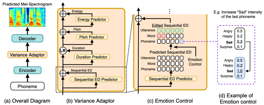 過去的研究主要集中在學(xué)習(xí)在話語層面上與語言韻律強(qiáng)相關(guān)的全局韻律表示。我們的研究目標(biāo)是構(gòu)建一個(gè)層次化的情感分布(Emotion Distribution),該分布能夠有效地涵蓋在各個(gè)粒度級(jí)別上的情感強(qiáng)度變化,包括音素、詞語和話語。在TTS訓(xùn)練期間,我們從真實(shí)音頻中提取出這一層次化的情感分布,并引導(dǎo)預(yù)測(cè)器建立情感和語言韻律之間的聯(lián)系。
