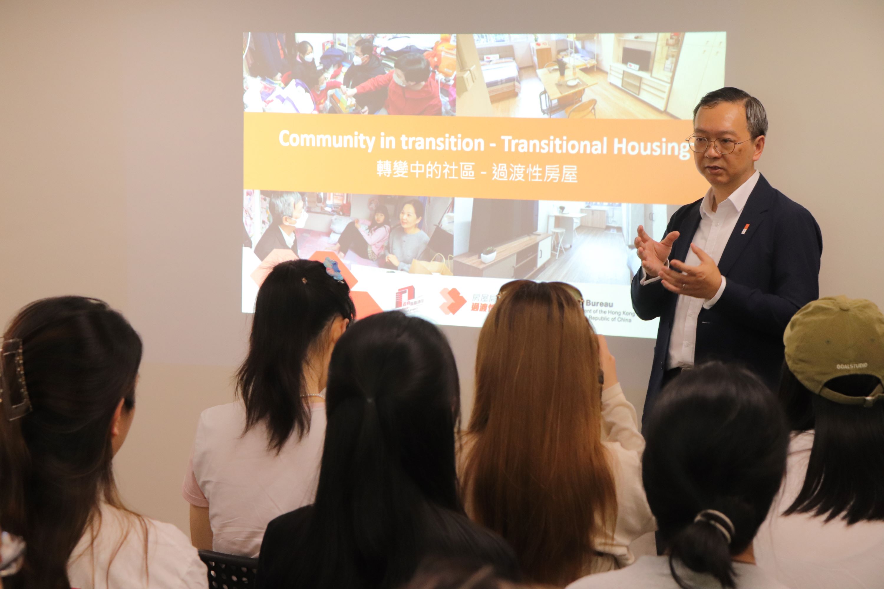 值得一提的是,學(xué)生們在香港特區(qū)房屋局的安排下,參觀了兩個創(chuàng)新房屋項目,包括位于象山邨由空置校舍改造的過渡性房屋“樂屋”,以及即將竣工的牛頭角彩興路過渡性房屋項目。研學(xué)營活動邀請了香港特別行政區(qū)政府房屋局副局長戴尚誠先生與學(xué)生們交流,分享香港結(jié)合創(chuàng)新、技術(shù)與環(huán)保的可持續(xù)城市發(fā)展經(jīng)驗。學(xué)生們了解到香港如何善用空置校舍等城市資源建造過渡性房屋,以及政府在工程中實踐可持續(xù)發(fā)展理念,為基層人士提供更適宜的居住環(huán)境和配套。