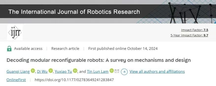2024年10月,IJRR在線發(fā)表題為“Decoding modular reconfigurable robots: A survey on mechanisms and design”的論文。該論文提出了一個創(chuàng)新且統(tǒng)一的結(jié)構(gòu)化框架,解決了模塊化自重構(gòu)機(jī)器人設(shè)計(jì)中的標(biāo)準(zhǔn)化和一致性問題。香港中文大學(xué)(深圳)博士生梁冠琪為論文第一作者,林天麟教授為論文獨(dú)立通訊作者。