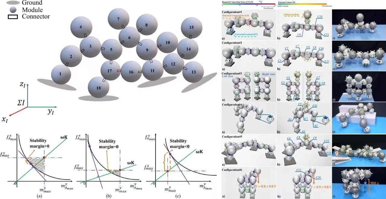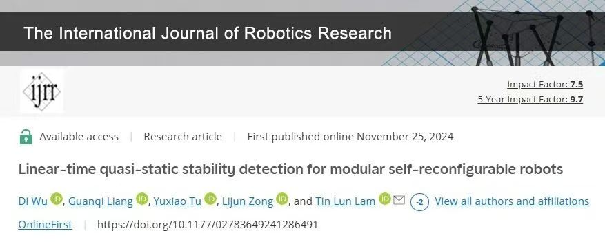 2024年11月,IJRR在線發(fā)表題為“Linear-time quasi-static stability detection for modular self-reconfigurable robots”的論文。該論文提出了一種適用于任意構(gòu)型的穩(wěn)定性檢測算法,為模塊化自重構(gòu)機(jī)器人系統(tǒng)的在線優(yōu)化和運(yùn)動規(guī)劃奠定基礎(chǔ)。香港中文大學(xué)(深圳)博士生吳迪為論文第一作者,林天麟教授為論文獨(dú)立通訊作者。
