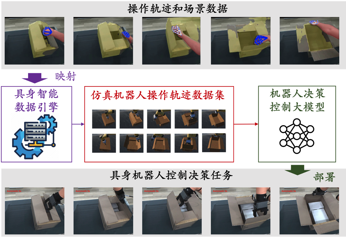 針對這些問題,劉桂良教授與團隊提出了基于生成式仿真的機器人數(shù)字引擎。該引擎依托強大的生成模型算法,能夠?qū)⒄鎸嵤澜绲臄?shù)據(jù)映射到虛擬環(huán)境中,在仿真空間內(nèi)生成多樣化的場景。通過這種方式,引擎能夠規(guī)模化地生成人形機器人操作技能數(shù)據(jù),并最終將這些數(shù)據(jù)無縫部署到真實機器人系統(tǒng)中,為機器人控制決策提供高效、低成本的數(shù)據(jù)支持。這一技術(shù)突破不僅大幅降低了數(shù)據(jù)采集的成本和復(fù)雜度,還為機器人操作大模型的訓練和泛化能力提供了堅實的數(shù)據(jù)基礎(chǔ)。