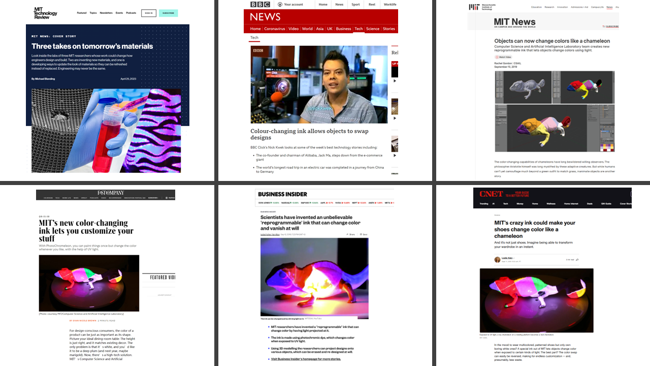 這項技術一經發(fā)表,便受到學術界以及社會的高度關注。靳教授憑借該研究成果于人機交互領域國際頂級會議ACM UIST 2019上同時斬獲最佳論文獎(Best Paper Award)以及最佳報告獎(Best Talk Award),并在全球計算機圖形和交互技術國際頂級會議SIGGRAPH 2020上獲得大會特別授予的DCEXPO未來科技特別獎(Emerging Technologies: DCEXPO Special Prize)。目前為止,靳教授的Photo-Chromeleon技術已受到數(shù)百家國際知名媒體的爭相報道,其中包括BBC國際新聞、MIT新聞、Businees Insider、Fast Company 、CNET等國際著名新聞媒體,同時也吸引了來自不同領域的著名企業(yè)(如Apple、華為、福特汽車、New Balance等)的廣泛關注。