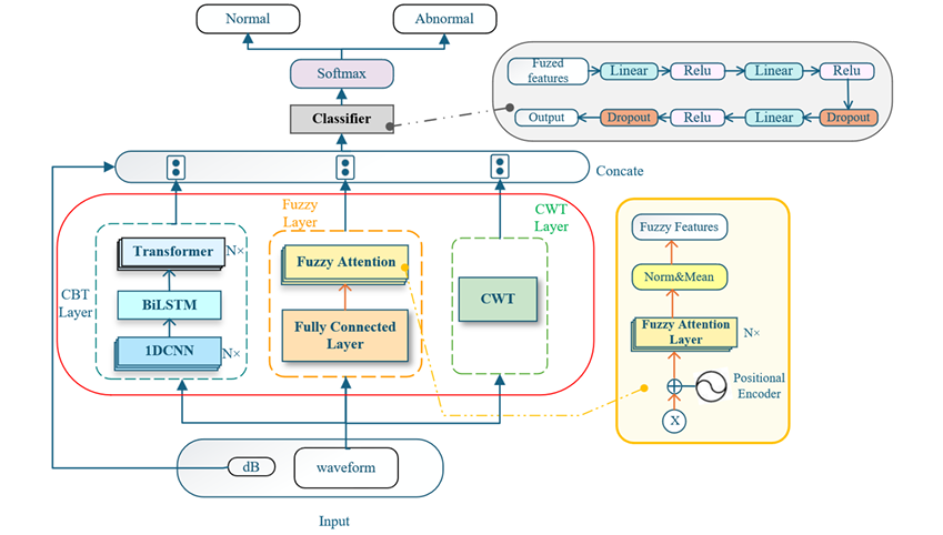 采用 CNN + BiLSTM + Transformer 網絡結構,充分挖掘ABR波形的時序與空間特征;引入連續小波變換(CWT)模塊,提取時頻域信息,有效抵抗噪聲干擾;設計模糊注意力機制,結合模糊隸屬度函數,顯著提升對“邊界模糊”樣本的識別能力;多分支特征融合,輸出聽力狀態二分類結果及對應概率,更直觀、更可靠。