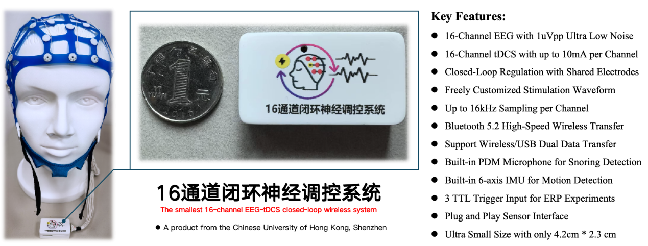 團隊自主研發自研的可穿戴閉環神經調控系統是一款集高性能與便攜性于一體,專為腦科學研究、神經調控和神經疾病診療(如癲癇檢測和預警)而設計的創新型研究工具。該設備采用16通道超低噪聲腦電采集技術,噪聲水平低至1μVpp,確保在復雜環境下依然能夠精準捕捉微弱的腦電信號,同時支持經顱電刺激功能,通過腦電的實時監測與反饋實現閉環的神經調控。該設備以超小型尺寸(僅4.2cm × 2.3cm)和輕量化設計為特色,僅U盤大小,佩戴舒適且便于攜帶,內置高性能鋰電池可持續工作超過12小時,適合長時間的患者健康數據監測。