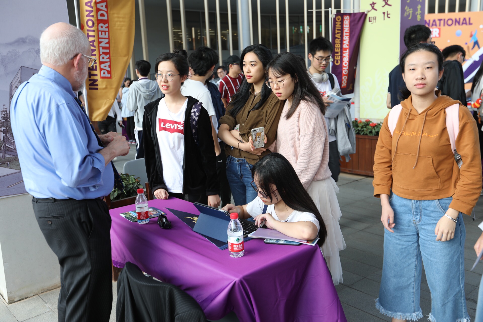? ? ? ? 下午,來自全球41所世界名校的教授、國際交流部門負責人和學校代表在教學樓連廊設置攤點,為學生提供有關海外學習項目的最新信息,面對面為學生提供申請攻讀碩博學位項目的咨詢和指導。