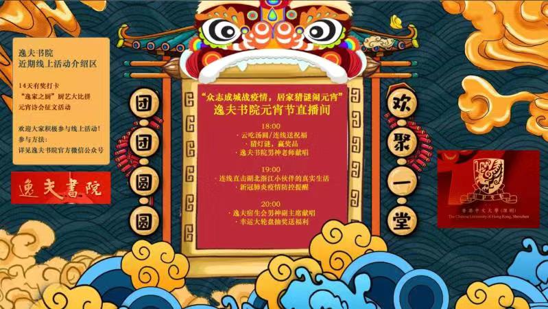 ? ? ? ? 雖然目前還未開學,但港中大(深圳)的四所書院依然為學生在正月十五元宵節準備了精彩的網上活動——“住在云里、樂在網上”:逸夫書院組織了“逸夫直播間:眾志成城戰疫情,居家猜謎鬧元宵”活動;學勤書院推出“非你莫‘鼠’學勤全民K歌大賽”;思廷推出“月夜靜思,熄燈一小時”活動,在線賞月,一起為地球祈福一小時;祥波書院組織了“祥波云動:元宵暖心線上活動”,一系列線上活動亦為2月17日即將開展的網上教學積累了經驗。