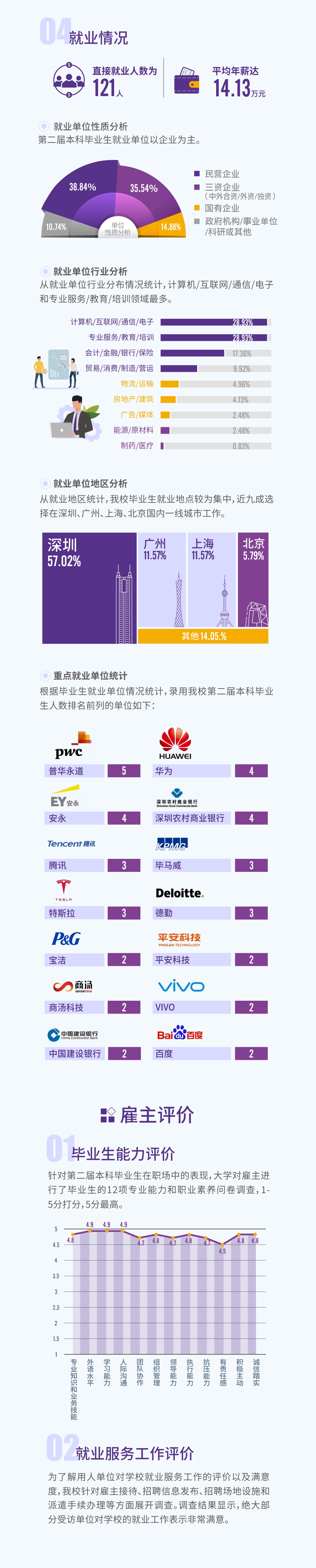 針對第二屆本科畢業生在職場中的表現,大學對雇主進行了畢業生的12項專業能力和職業素養問卷調查。結果顯示,雇主對畢業生的滿意度非常高,尤其對畢業生在英語水平、學習能力和人際溝通等方面展示出的優秀素養非常認可。