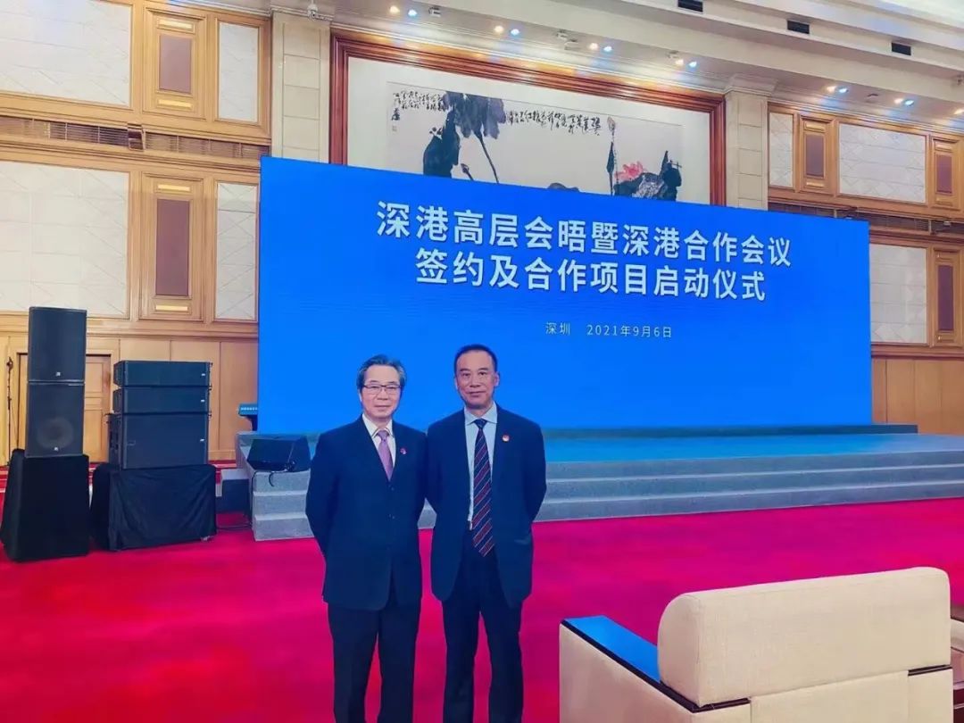 ? ? ? ? 港中大(深圳)校長徐揚生教授(右一)與醫學院院長鄭仲煊教授(左一)在深港高層會晤暨深港合作會議簽約及合作項目啟動儀式上合影