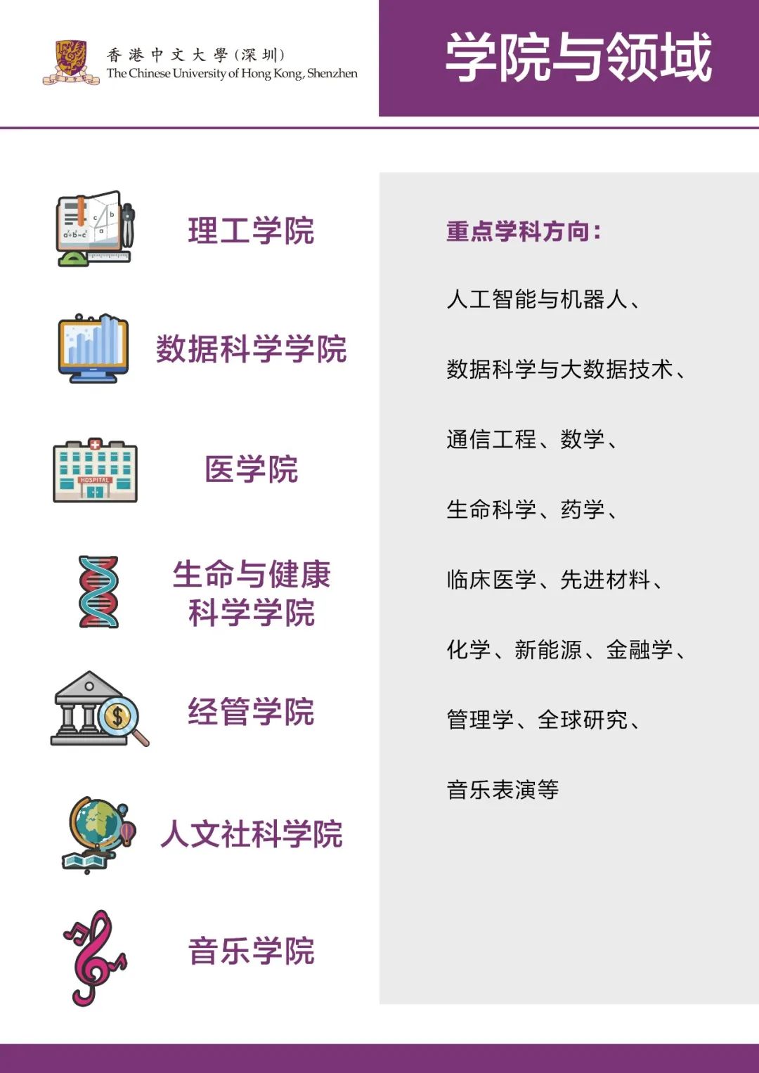 ? ? ? ?經(jīng)過七年的發(fā)展,大學(xué)學(xué)科建設(shè)已逐步完善,現(xiàn)有經(jīng)管學(xué)院、理工學(xué)院、人文社科學(xué)院、生命與健康科學(xué)學(xué)院、數(shù)據(jù)科學(xué)學(xué)院、醫(yī)學(xué)院和音樂學(xué)院七個學(xué)院和一個研究生院。截至目前,大學(xué)已開設(shè)22個本科專業(yè),25個研究生(碩士、博士)項(xiàng)目。目前,來自世界各地的8000多名優(yōu)秀學(xué)子正在港中大(深圳)求學(xué)。