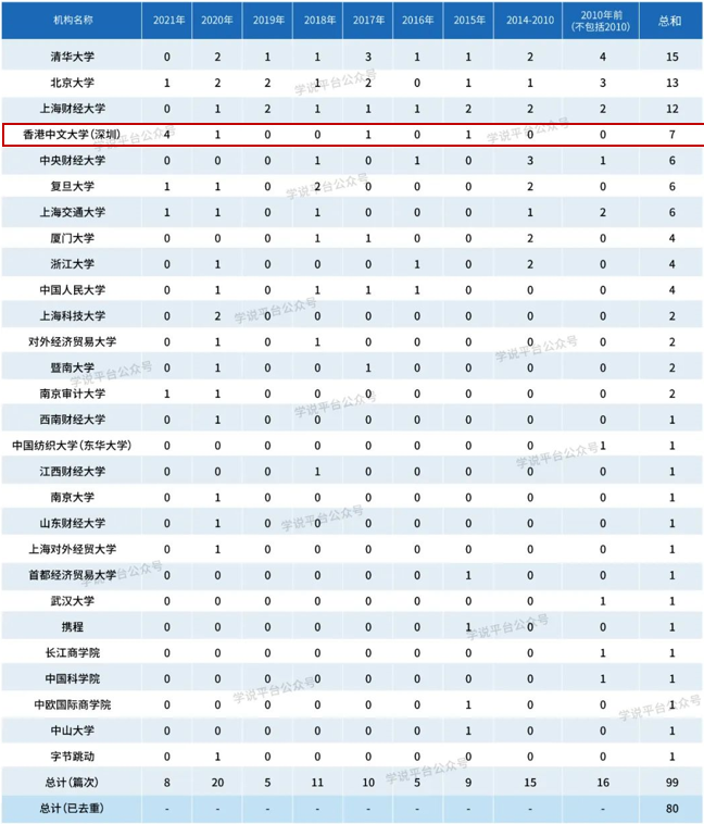 值得關(guān)注的是,2021年中國(guó)大陸高校及機(jī)構(gòu)在五大頂刊共發(fā)表論文八篇,其中港中大(深圳)經(jīng)管學(xué)院發(fā)表四篇,占發(fā)表總數(shù)的一半,位居榜首。