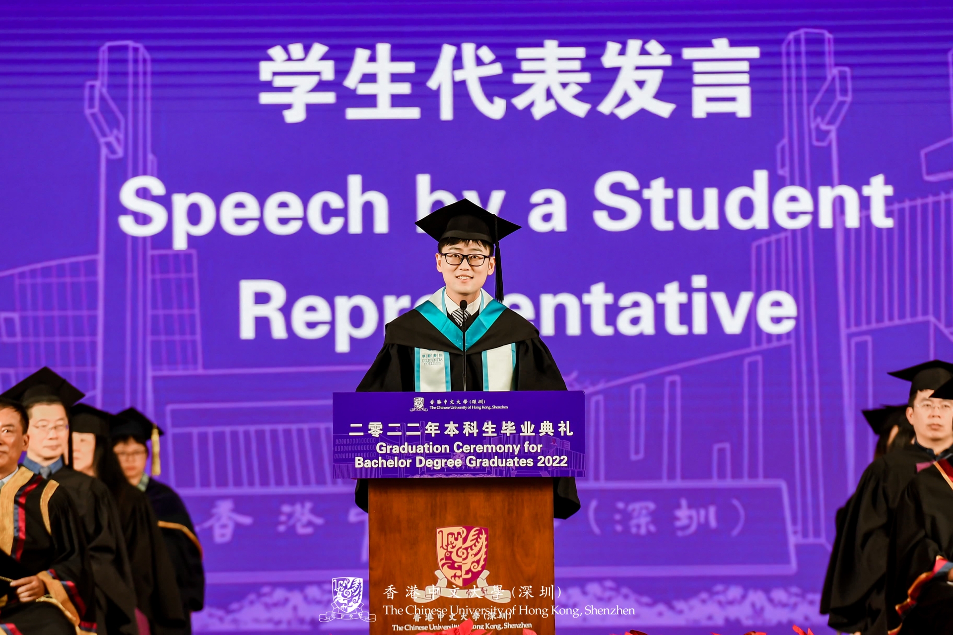 ? ? ? ?在港中大(深圳),成功與否并非由成績來定義。只有你,才能定義自己的成功。在這里,我想對學業成績優秀的同學致以衷心的祝賀,同時也希望與我所代表的那些追求多元化發展的學子共勉,因為多元發展同樣是大學所追求的育人目標。在港中大(深圳),我們能夠接觸到來自不同國家、地區和社區,以及不同專業、才能、研究領域和職業的全方位多元化人士。大學鼓勵學子尊重差異,探索自己的興趣。多樣性是通往更多可能性和創造性的大門。感謝大學在過去的四年里給予我們的自由,讓我們擁有如此愉快的大學生活。感謝身邊老師同學四年來的幫助與鼓勵,感謝家人一路以來的關心與理解,感謝大學不斷的支持與包容,感謝社會各界見證我們的成長。”
