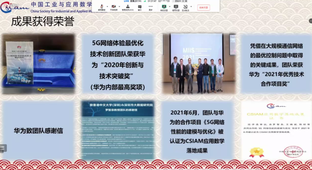 ? ? ? ?會上,香港中文大學(深圳)副校長(學術)、深圳市大數據研究院院長羅智泉院士因其在大規模無線網絡性能優化方面的杰出貢獻榮獲首屆王選應用數學獎。王選應用數學獎設立于2018年,今年是首屆頒獎,主要獎勵將數學研究成果落地應用并產生重大價值的杰出科學家。