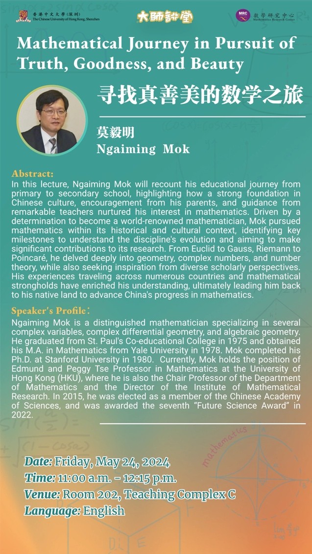 講者從自身的中小學教育說起,闡述他如何在堅實的中華文化基礎上,在父母親的鼓勵與良師的善導下培養了對數學的興趣,并下定決心要當世界級數學家。由于對歷史文化的興趣,他在數學發展的長河里尋找關節點,以全面了解數學發展脈絡的視覺,力求作出有深遠影響的數學研究。從歐幾里得、高斯、黎曼到龐加萊,他在圍繞著幾何、復數與數論深耕的同時也不斷尋覓他山之石。他累積了自身對科學以至人文的歷史發展過程的心得,在游歷諸多國度與數學要塞后,因緣際會回到故鄉為我國的數學進程繼續作出貢獻。