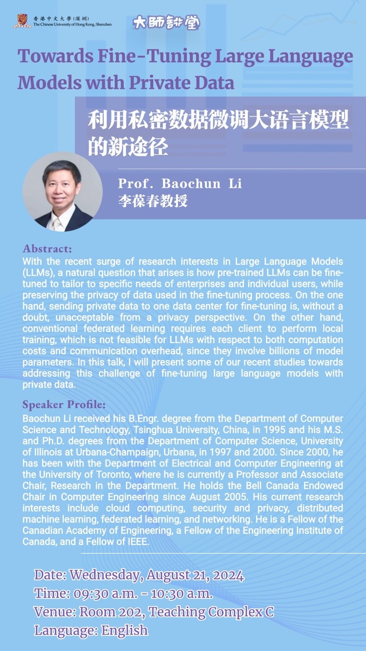 李葆春教授于1995年在清華大學(xué)獲得計(jì)算機(jī)科學(xué)與技術(shù)學(xué)士學(xué)位,隨后分別于1997年和2000年在伊利諾伊大學(xué)厄巴納—香檳分校計(jì)算機(jī)科學(xué)系獲得碩士和博士學(xué)位。2000年,他加入多倫多大學(xué)電氣與計(jì)算機(jī)工程系,現(xiàn)任該系教授兼科研副主任。2005年8月,李教授擔(dān)任貝爾加拿大計(jì)算機(jī)工程教授。他的研究領(lǐng)域涵蓋云計(jì)算、信息安全與隱私保護(hù)、分布式機(jī)器學(xué)習(xí)、聯(lián)邦學(xué)習(xí)及網(wǎng)絡(luò)技術(shù)。