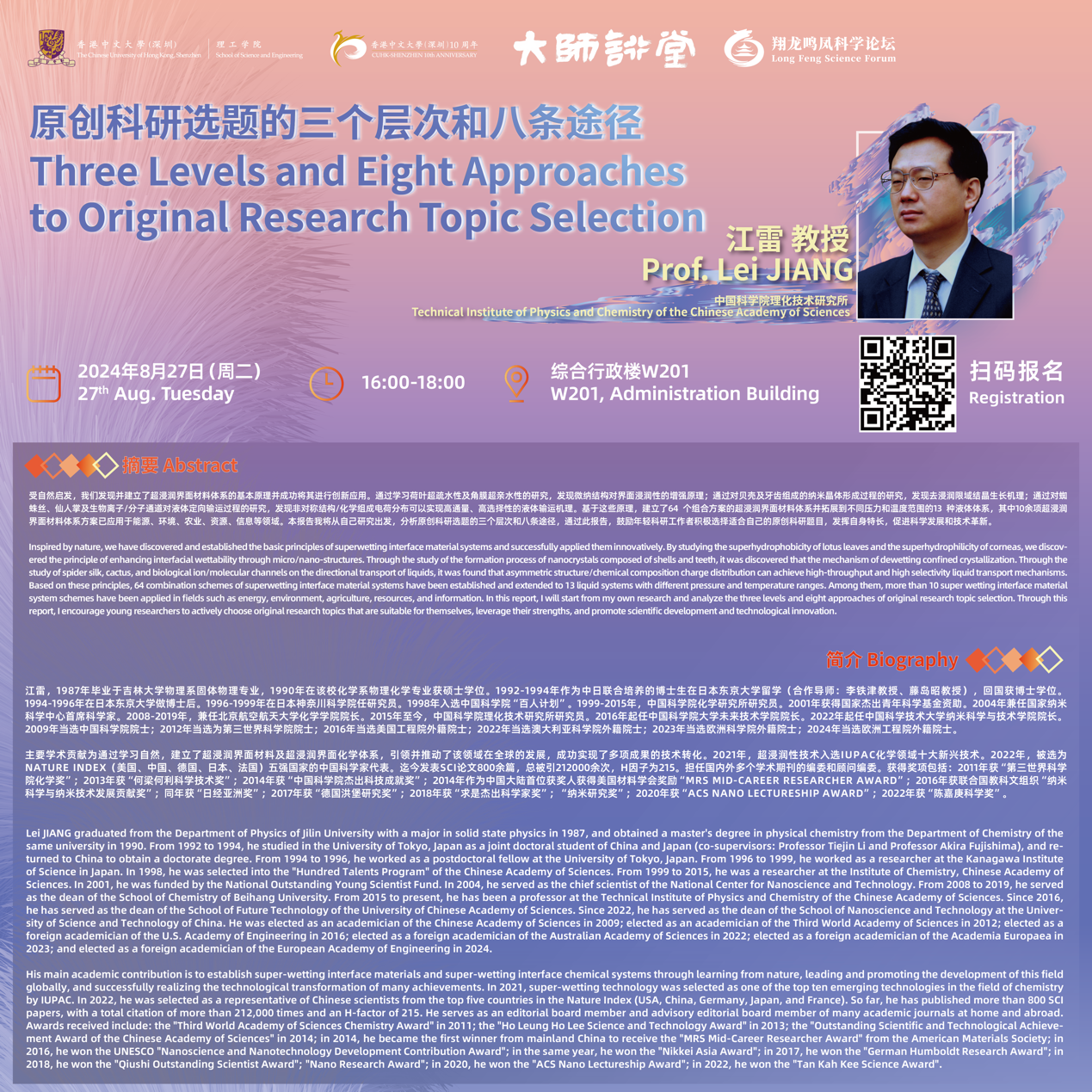 江雷,1987年畢業(yè)于吉林大學物理系固體物理專業(yè),1990年獲得該校化學系物理化學專業(yè)碩士學位。1992至1994年作為中日聯(lián)合培養(yǎng)的博士生在日本東京大學留學(合作導師:李鐵津教授、藤島昭教授),回國獲博士學位。1994至1996年在日本東京大學做博士后。1996至1999年在日本神奈川科學院任研究員。1999至2015年,中國科學院化學研究所研究員。2001年獲得國家杰出青年科學基金資助。2004年兼任國家納米科學中心首席科學家。2008至2019年,兼任北京航空航天大學化學學院院長。2015年至今,中國科學院理化技術研究所研究員。2016年起任中國科學院大學未來技術學院院長。2022年起任中國科學技術大學納米科學與技術學院院長。2009年當選中國科學院院士;2012年當選為第三世界科學院院士;2016年當選美國工程院外籍院士;2022年當選澳大利亞科學院外籍院士;2023年當選歐洲科學院外籍院士;2024年當選歐洲工程院外籍院士。