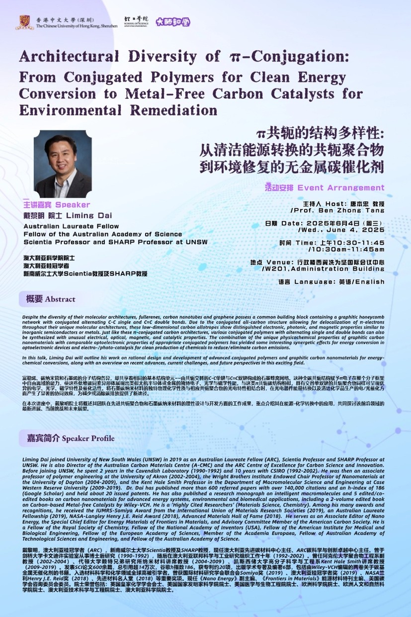 在本次講座中,我將概述我們在先進共軛聚合物和石墨碳納米材料的理性設計與開發方面的工作成果,重點介紹其在能源-化學轉換中的應用,共同探討該前沿領域的最新進展、當前挑戰和未來展望。