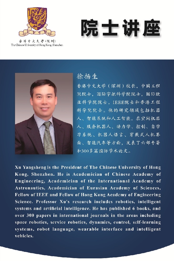 ?????? 徐揚(yáng)生教授是香港中文大學(xué)(深圳)校長(zhǎng),中國(guó)工程院院士,國(guó)際宇航科學(xué)院院士,國(guó)際歐亞科學(xué)院院士,IEEE院士和香港工程科學(xué)院院士。他的研究領(lǐng)域包括 機(jī)器人、智能系統(tǒng)和人工智能。在空間機(jī)器人、服務(wù)機(jī)器人、動(dòng)力學(xué)、控制、自學(xué)習(xí)系統(tǒng)、機(jī)器人語(yǔ)言、穿戴式人機(jī)界面、智能汽車等方面,發(fā)表了6部專著和 300多篇國(guó)際學(xué)術(shù)論文。