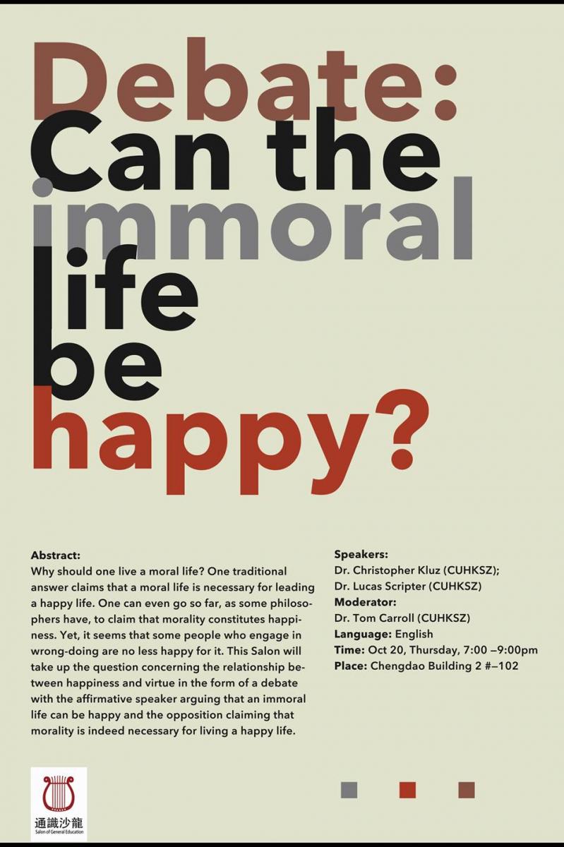 為什么人們需要道德生活?傳統(tǒng)意義上的回答是,對于過一個快樂的生活而言,道德生活有其必要性。一部分的哲學家更認為,快樂是由道德和品行所構成。但是,一些從事不道德的行為的人,居然能為他們的行為感到快樂。這次沙龍以辯論的形式,來探討快樂和美德之間的關系。支持者認為一個不道德的人生能夠使人快樂,然而反對者堅持認為美德是構建幸福快樂生活的不可缺少的一部分。?