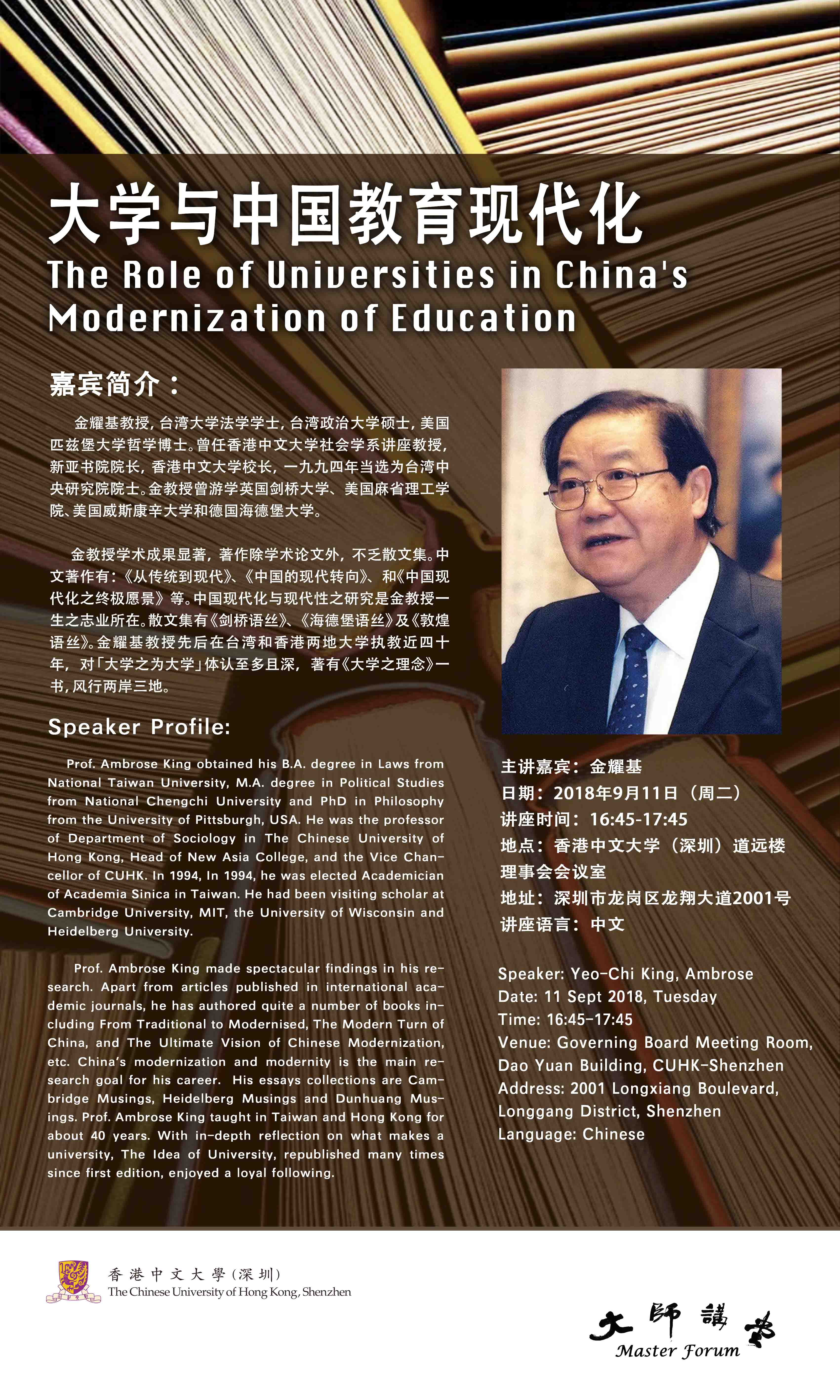 9月11日(周二),香港中文大學(深圳)邀請到著名社會學家、原香港中文大學校長金耀基教授做客“大師講堂”,與大家分享“大學與中國教育現代化”。誠邀我校師生及社會各界朋友參與。