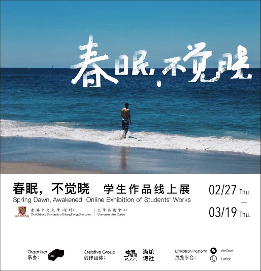 關于展覽: “春眠,不覺曉”線上展由大學藝術中心主辦,TC101空間策劃,展出大學“PIC攝影社”與“滌綸詩社”同學的原創作品。所有展現均源自同學們對于日常瞬間的積累和斟酌,其中不乏對人、景、物以及諸多生活所見的捕捉,以及從鏡頭畫面衍生出的自創詩作。共計攝影作品229幅,現代詩作品72首。因受疫情影響,此展決定搬至線上,按原計劃的約定和大家如期見面。時光不停,藝術不停,即使我們暫無法在TC101空間相聚,也不影響在屏幕上看一看美好的春光。展覽題目“春眠,不覺曉”似乎也有了新的含義,當不知不覺天亮時,太陽還如往常熱烈, 映著水波溫柔。