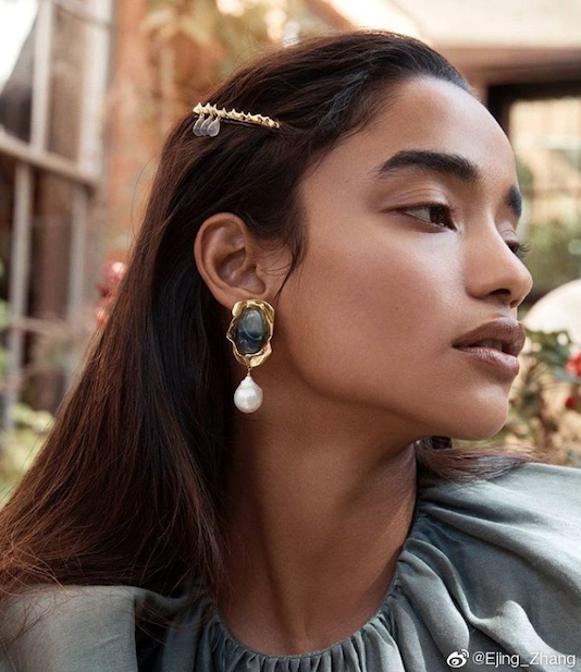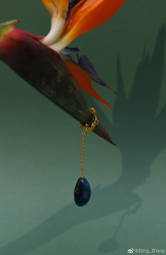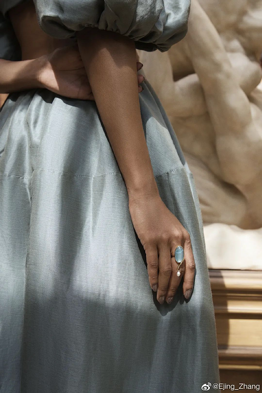 這系列設(shè)計(jì)靈感來自于比利時(shí)畫家Constant Montald?1862年創(chuàng)作的油畫La?fontaine de l’inspiration,藍(lán)色的夜幕下,神秘的金色森林里,胴體幾近透明的少男少女在汲取靈感之泉。設(shè)計(jì)中突出的雕塑感金屬造型取材于前拉斐爾時(shí)期油畫里繆斯華服的褶皺造型,和細(xì)膩中有些神秘的樹脂顏色搭配。