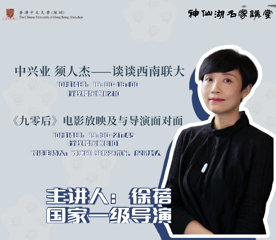 10月14日(本周四)下午,著名導演徐蓓將做客香港中文大學(深圳)“神仙湖名家講堂”,與大家分享關于西南聯大的故事。誠邀各位前往行政樓東翼E210參與本期講堂。當晚,《九零后》電影放映及與導演面對面將在行政樓東翼E101舉行。紀錄電影《九零后》是徐蓓導演的代表作之一。