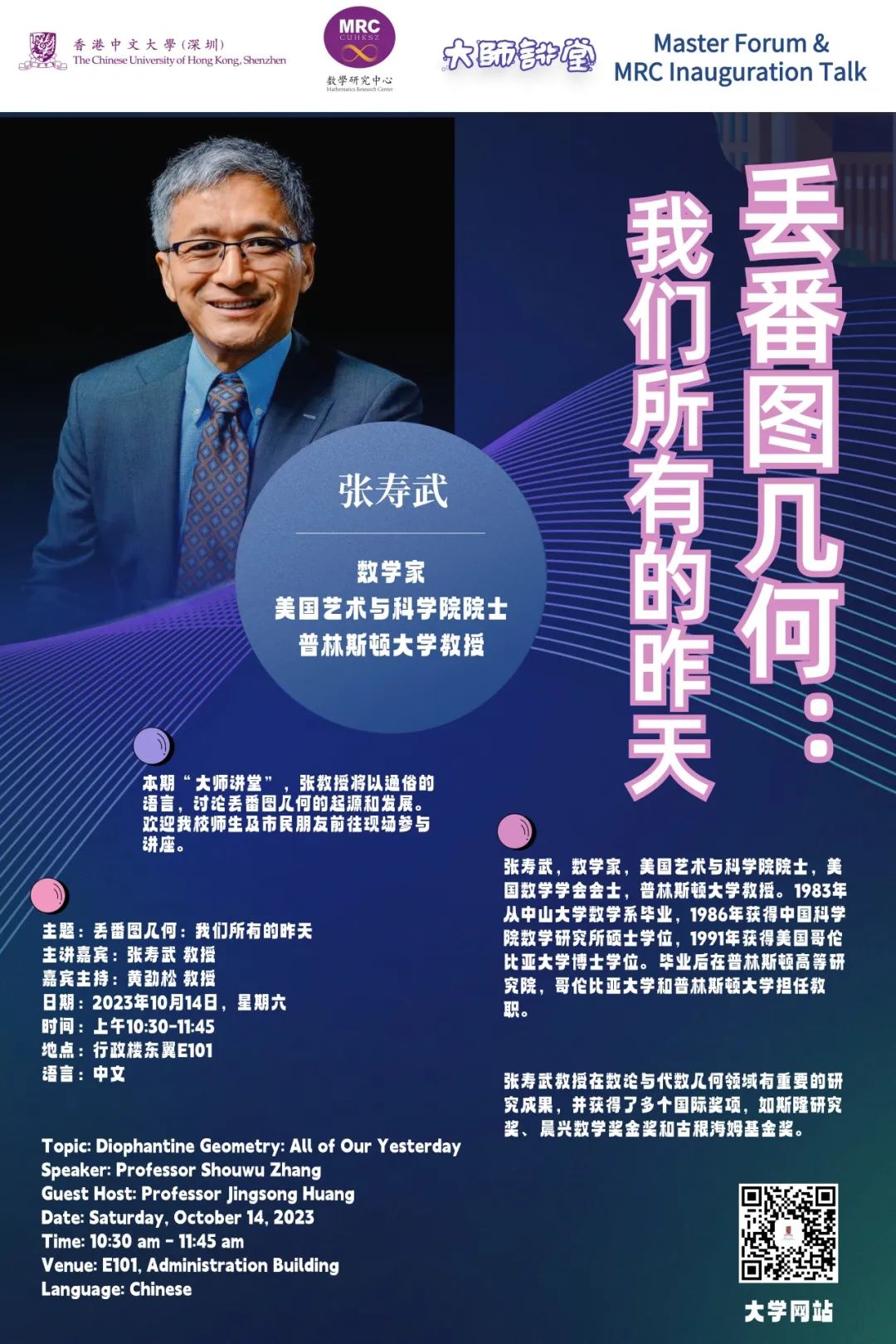 ?10月14日周六上午,香港中文大學(xué)(深圳)榮幸地邀請到數(shù)學(xué)家、美國藝術(shù)與科學(xué)院院士、普林斯頓大學(xué)教授張壽武做客大師講堂。他將以“丟番圖幾何:我們所有的昨天”為主題做相關(guān)演講。
