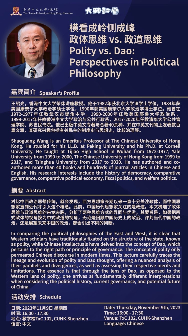 11月9日下午四點,香港中文大學(深圳)榮幸地邀請到香港中文大學榮休講座教授王紹光教授做客大師講堂。他將以“橫看成嶺側成峰:政體思維 vs. 政道思維”為主題做相關演講。
